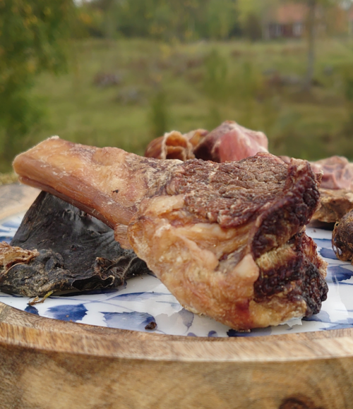 Råvarorna är helsvenska från södra Sverige. Varsamt torkad, utan tillsatser och all produktion sker i fabrik i Småland. Korta transporter, svenska djur från svenska skogar och gårdar.